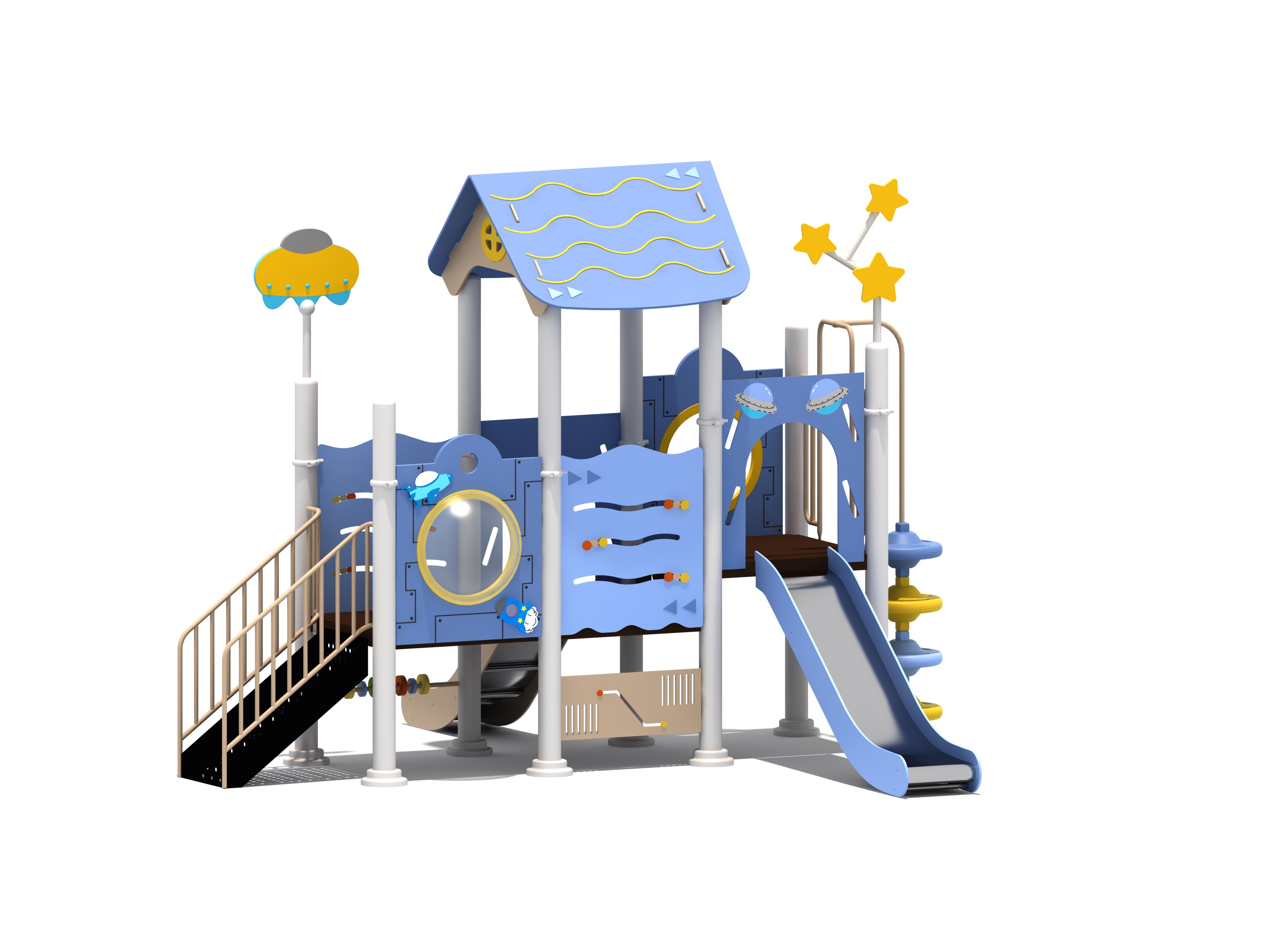 The customized children playground equipment has a unique space-themed appearance, with a blue roof decorated with wavy lines and circular windows with yellow frames. The blue slide on one side offers kids exciting gliding fun, while the stairs with railings ensure safe climbing. The added interactive bead rails allow children to play with partners, enhancing their hand-eye coordination and social skills during play.