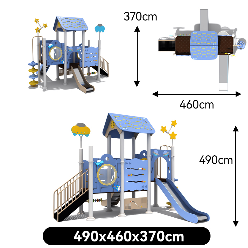 Our ML-PE-002 stainless steel playground slide is a premium commercial outdoor play equipment designed for parks, schools and community centers. With a dimension of 460×370×490cm, this equipment combines durable materials and creative space-themed design to provide kids with safe, entertaining and educational play experiences. As a leading product of MONLE, it complies with EU EN1176 and ASTM standards, making it a reliable choice for all outdoor play space projects. The slide is equipped with interactive elements like colorful bead rails, yellow UFO-shaped ornaments and star decorations, which can stimulate children’s imagination while encouraging physical exercise.