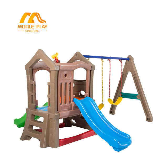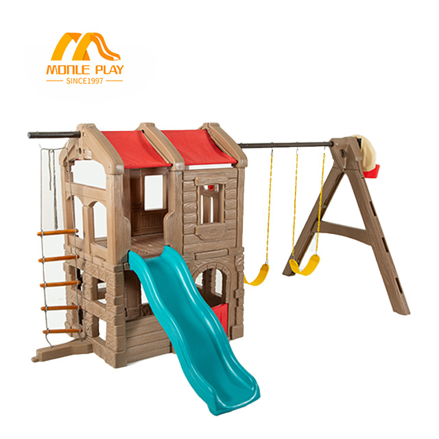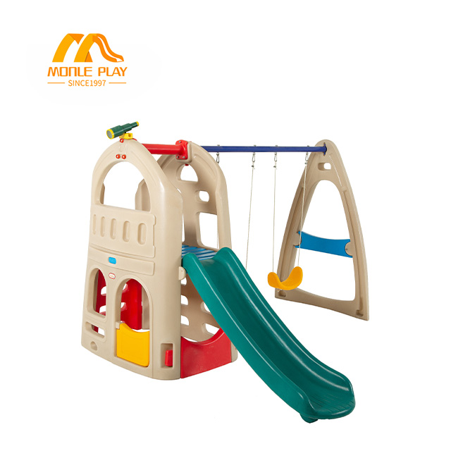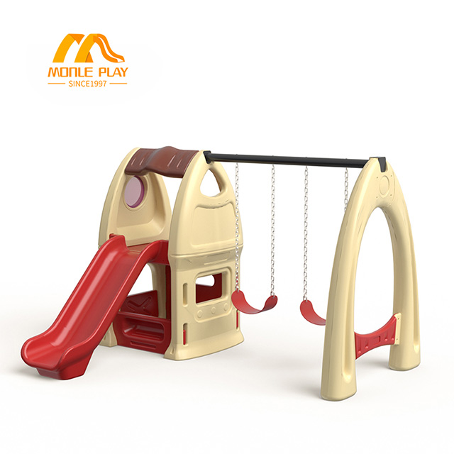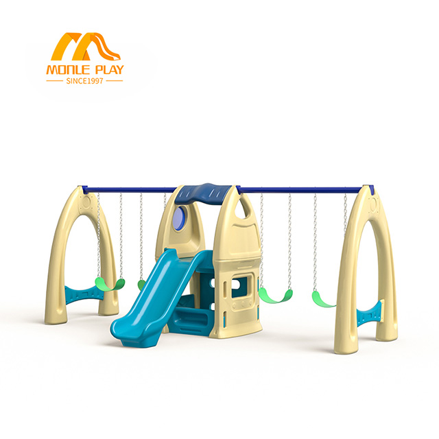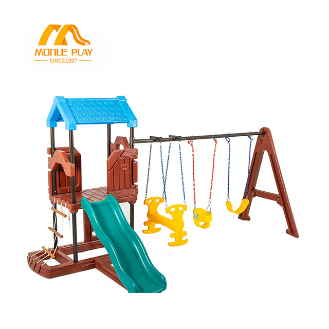 This swing - integrated playground equipment is mainly made of high - quality plastic and metal. The main body, including the slide and the frame structures, is constructed from durable, non - toxic plastic. This material is not only lightweight, making the equipment easy to install and move (to a certain extent), but also has good weather resistance, which allows it to withstand various outdoor weather conditions such as sunlight and rain without being easily damaged or deformed. The chains for the swings and the horizontal bar that supports the swings are made of metal. Metal materials ensure the sturdiness and load - bearing capacity of these parts, providing a safe guarantee for children when they swing. Overall, the combination of plastic and metal materials makes the equipment both safe and durable for children's play.
