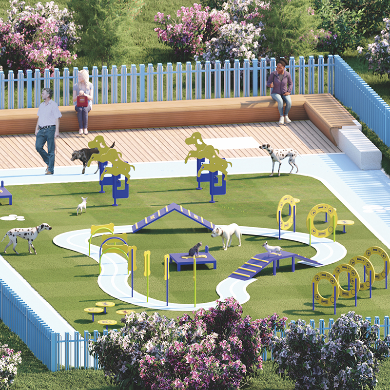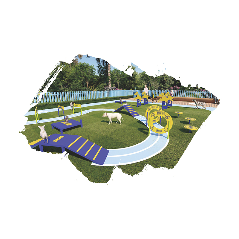 The Pets Exercise PE Plate Dog Training System Equipment (Model: ML - DTE - 002) is a professional outdoor pet training facility designed to enhance dog training efficiency, improve pet physical fitness, and strengthen the bond between dogs and their owners. This well - structured training system is enclosed by a light blue fence, surrounded by lush flowers and greenery, creating a comfortable and safe training environment. It is equipped with a variety of bright yellow and blue training apparatuses, including hurdles, tunnels, ramps, and platforms, arranged along a winding path to provide a comprehensive training course for dogs of different breeds and sizes. Additionally, there is a wooden seating area outside the training zone for pet owners to rest and watch their pets. As a Dog Park Playground and Pets Training Toys combination, it is suitable for pet training schools, dog parks, and pet - loving families.